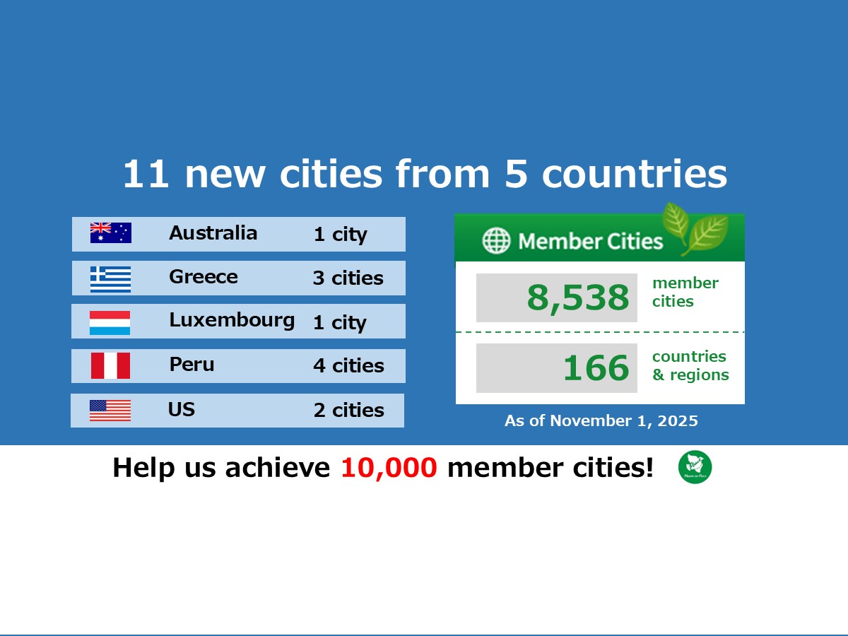 Currently, the Mayors for Peace network has grown to over 8,400 member cities, but we need about 1,600 more cities to reach our target.