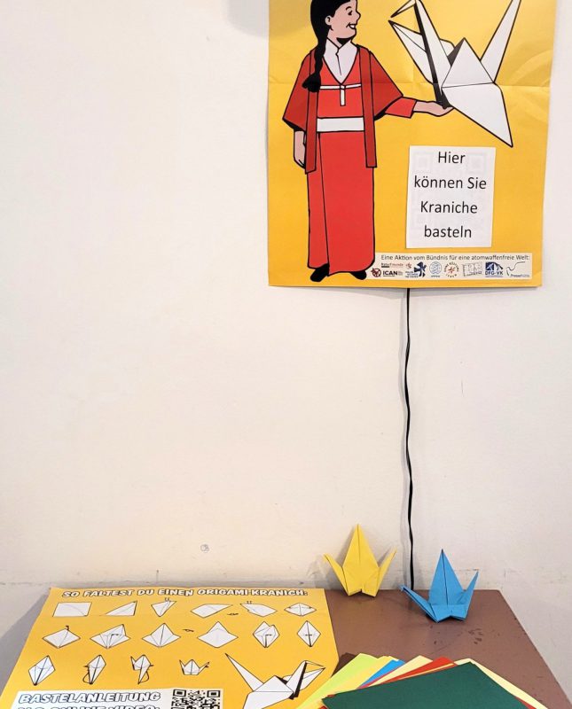 On the one hand, 22 poster from the Mini Atomic Bomb Exhibit showing images of the destruction of Hiroshima and Nagasaki following the U.S. atomic bombings of August 6 and 9, 1945, and on the other hand, 25 artworks from the Mayors for Peace Children’s Art Competition “Peaceful Towns” were on display in the upper foyer of City Hall. Along with the exhibition, paper cranes were displayed, inviting visitors to fold them as a symbol of peace.