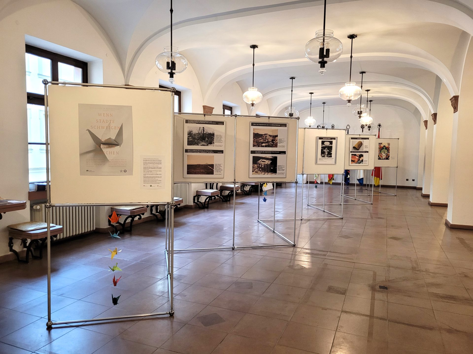 On the one hand, 22 poster from the Mini Atomic Bomb Exhibit showing images of the destruction of Hiroshima and Nagasaki following the U.S. atomic bombings of August 6 and 9, 1945, and on the other hand, 25 artworks from the Mayors for Peace Children’s Art Competition “Peaceful Towns” were on display in the upper foyer of City Hall. Along with the exhibition, paper cranes were displayed, inviting visitors to fold them as a symbol of peace.