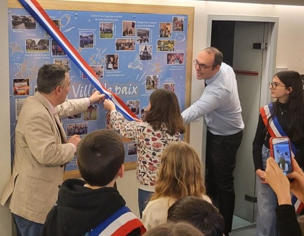We presented the diploma received from the Mayors For Peace secretariat and the gifts offered by the municipality and the Varennes-Vauzelles memory association. Then, Émilie, the mayor, the children who participated in our activities, and the elected members of the youth council cut the ribbon to inaugurate the Wall of Peace, which commemorates all the actions our town has taken to defend this essential value in these troubled times.