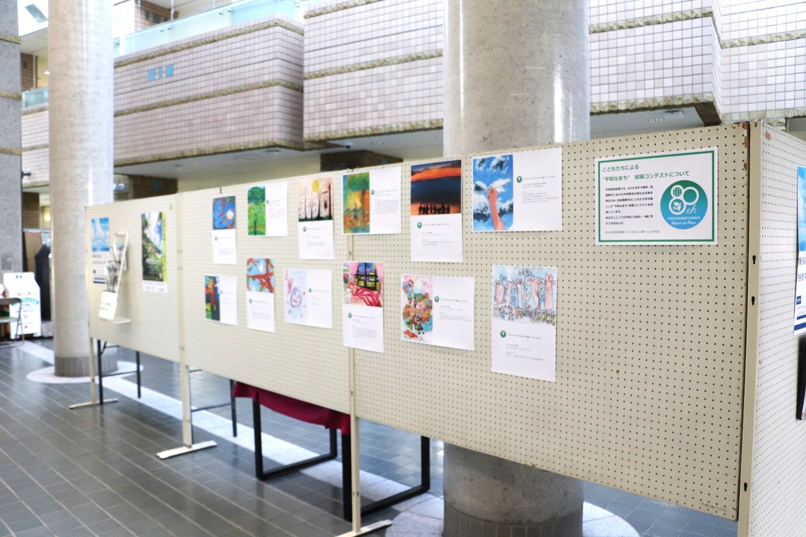 戦中・戦後の市内を撮影した写真展示や、市内に残る慰霊碑の調査と共に、平和首長会議原爆ポスター展と、こどもたちによる“平和なまち”絵画展のコーナーを設け、平和首長会議80周年のロゴも含めて、市民の皆さんにご紹介しました。