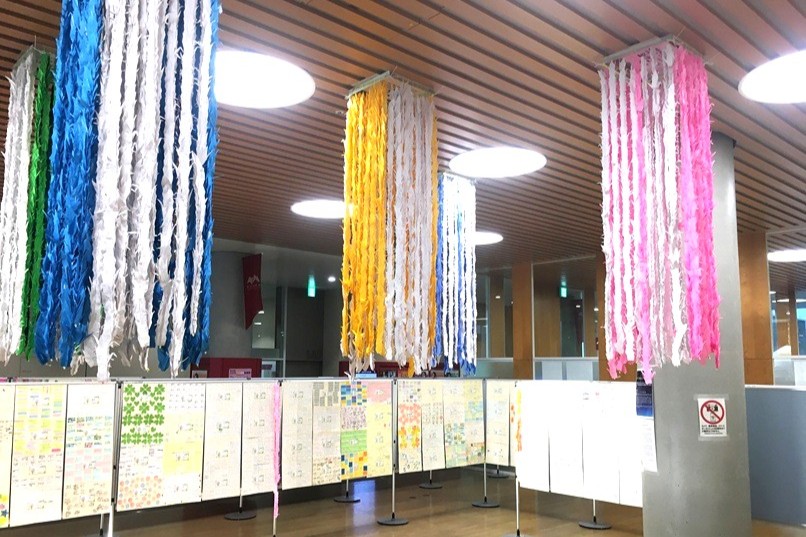 令和7年度は、市内の小学生が作成した折り鶴約14,500羽をもとにしたオブジェ(市内にある岡学園トータルデザインアカデミー長野プロデュース科の学生にデザイン・オブジェ作成に協力いただきました)と、各小学校クラスごとに書かれた平和へのメッセージ(寄せ書き)を、8月1日から8月17日の期間、長野市役所第一庁舎1階市民交流スペースに展示しました。