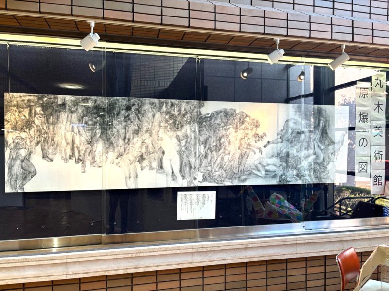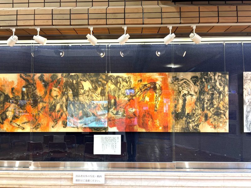 今年度は戦後80年の節目であることから通常行っている規模を拡大して、丸木美術館から「原爆の図」を借用して展示しました。今回借用した図は第一部「幽霊」、第二部「火」、第三部「水」です。原子爆弾が落とされた瞬間の広島の情景が鮮明に描かれています。