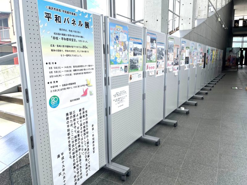 秋田県湯沢市 「平和パネル展」を開催 2025年8月5日~8月15日[秋田県湯沢市] 加盟都市の活動 2025年12月4日 秋田県湯沢市では、令和7年8月5日から15日の間、非核・平和都市事業「平和パネル展」を開催しました。 今年度は、市役所本庁舎をはじめ市内3か所で展示を行い、より多くの方に戦争の悲惨さ、平和の大切さ、そして命の尊さについて学びを深めてもらうきっかけとなりました。 本市では、戦争・核兵器のない平和な世界の実現に向け、来年度以降も継続して平和関連事業に取り組んでまいります。 湯沢市生涯学習センター 湯沢市雄勝文化会館 湯沢市役所本庁舎 市民ロビー [写真提供:湯沢市] 平和文化の振興