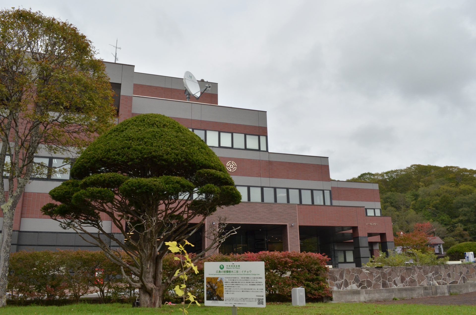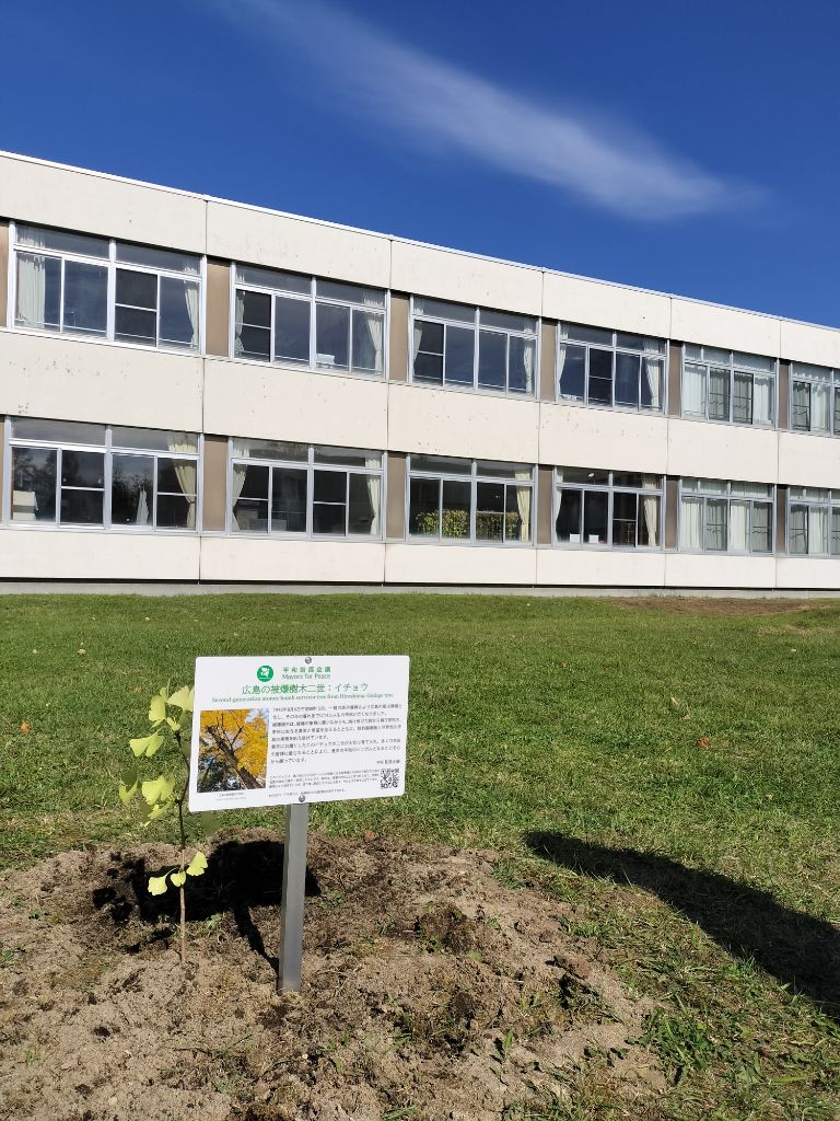 令和7年10月1日に被爆80年・釧路町核兵器廃絶平和宣言40年の節目として、当日は釧路町職員ほか、釧路町議会議員ら40名あまりが参加し、役場庁舎前庭に広島から届いた被爆イチョウ二世の苗木を植樹いたしました。