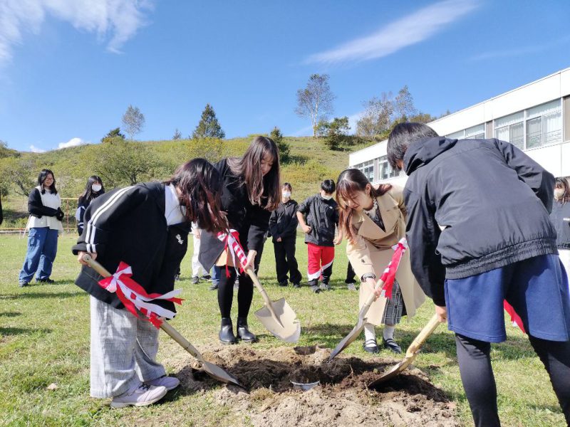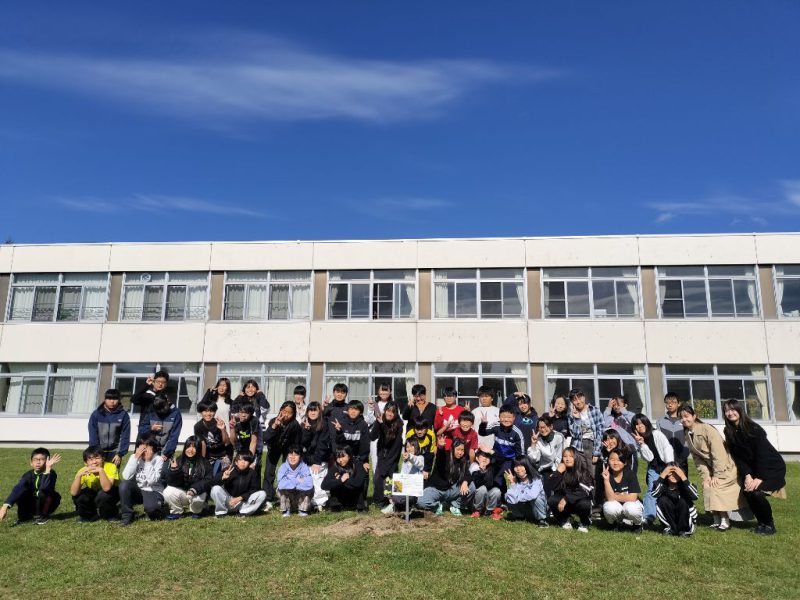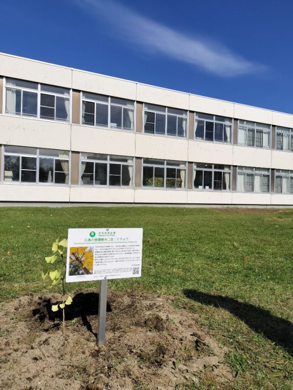 令和7年10月10日にナガサキ・ユース代表団の大学生2名と釧路町立遠矢小学校の5年生・6年生合わせて59名が、学校の中庭に広島から届いた被爆イチョウ二世の苗木を植樹いたしました。