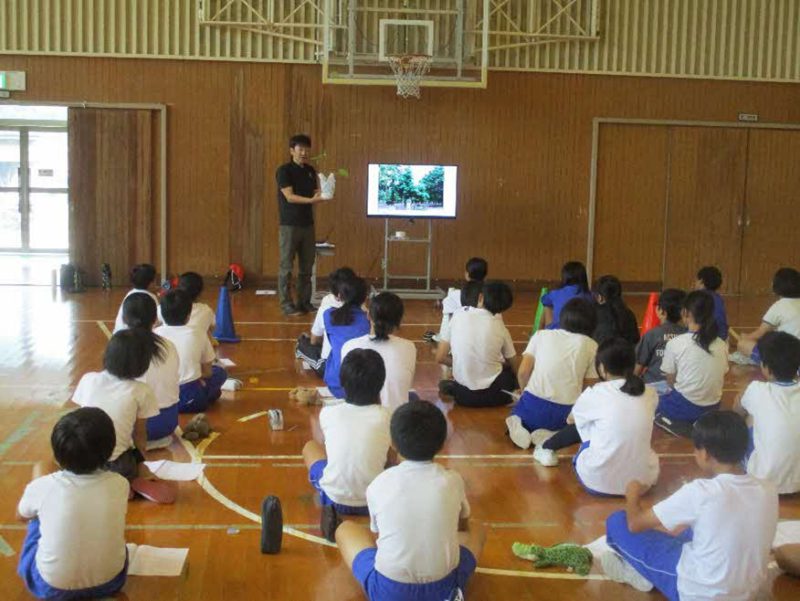 吉賀町連合修学旅行で、広島平和記念公園の散策や資料館の見学、語り部さんの講話を聞く活動を行うにあたり、事前の集合学習時にこの度いただいたアオギリの苗木を見せ、被爆アオギリについての説明を行いました。