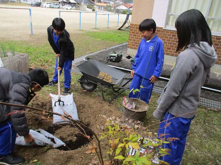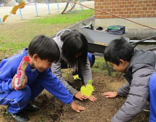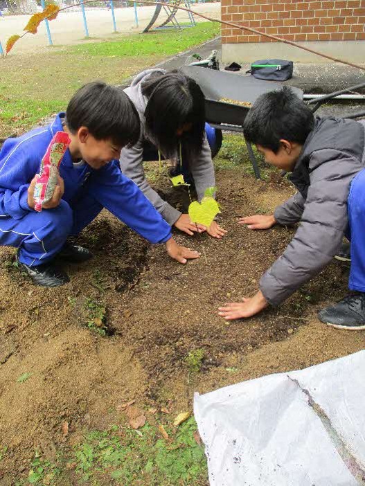 そして、修学旅行で広島平和記念公園を訪れた際、興味をもって実際の被爆アオギリを見たり、被爆アオギリについての解説を読んだりする児童が多くいました。修学旅行を終え、六日市小学校の6年生により鉢植えに植え替えて成長の様子を観察し、最終的に地植えに植え替えを行いました。