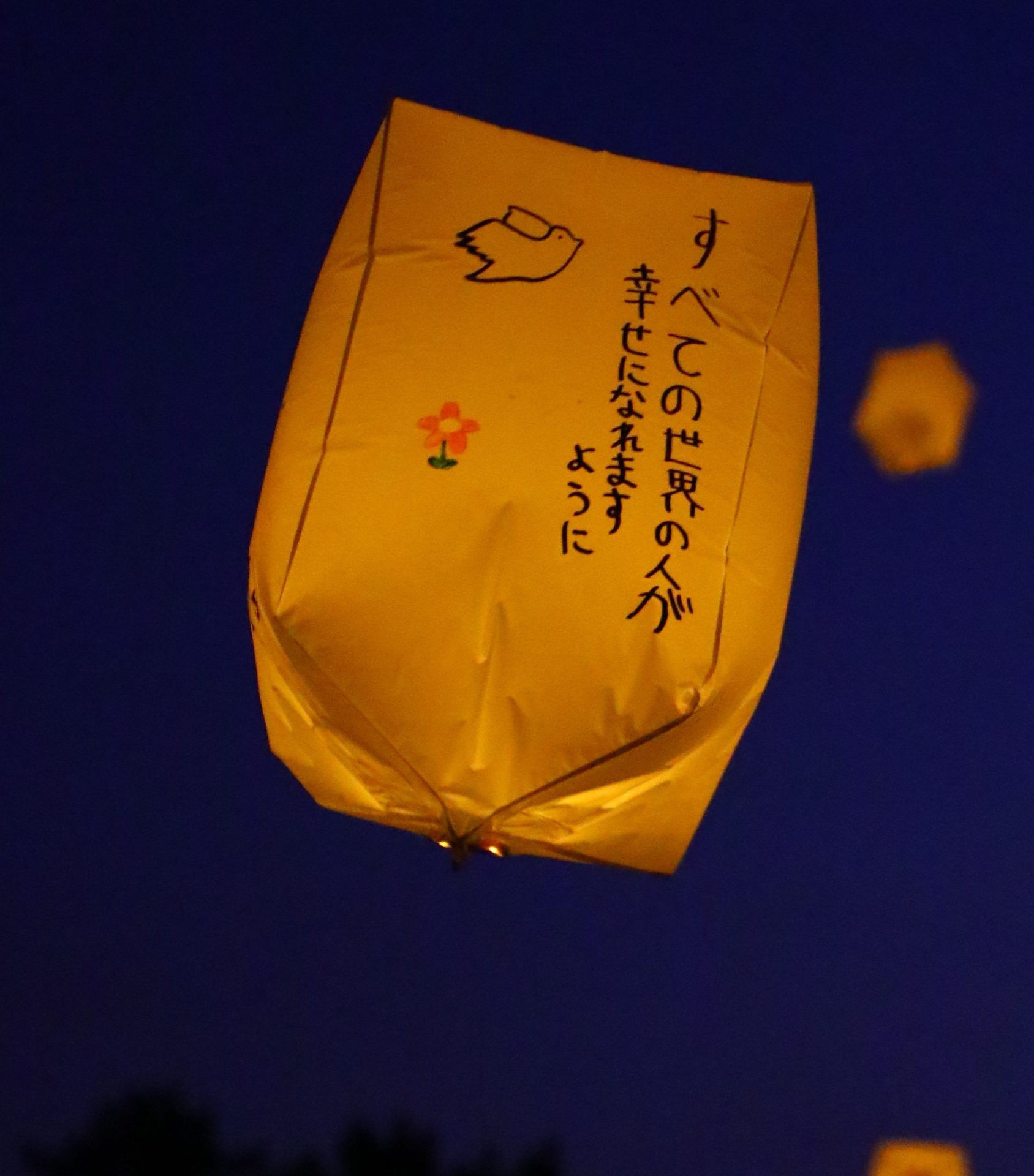 そして事業の締めくくりとして、7月27日(日)、子どもたちが平和への願いを一つひとつ言葉に込めたスカイランタンを夜空へと放ちました。身近な玉村町にも戦争があったことを学び、心に残る体験を通して、改めて平和について考える大切な機会となりました。