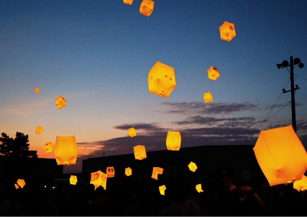 そして事業の締めくくりとして、7月27日(日)、子どもたちが平和への願いを一つひとつ言葉に込めたスカイランタンを夜空へと放ちました。身近な玉村町にも戦争があったことを学び、心に残る体験を通して、改めて平和について考える大切な機会となりました。