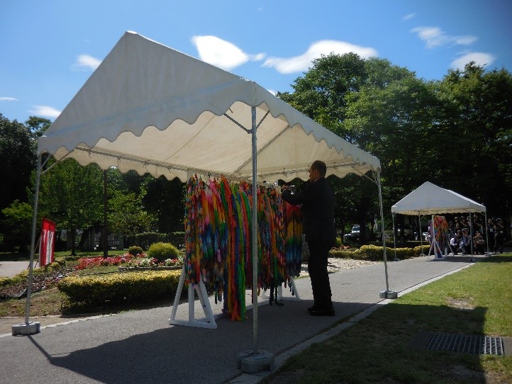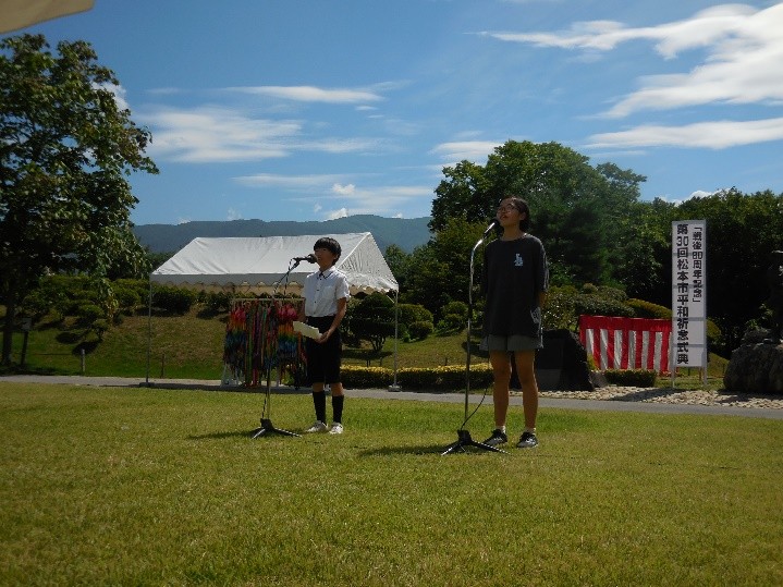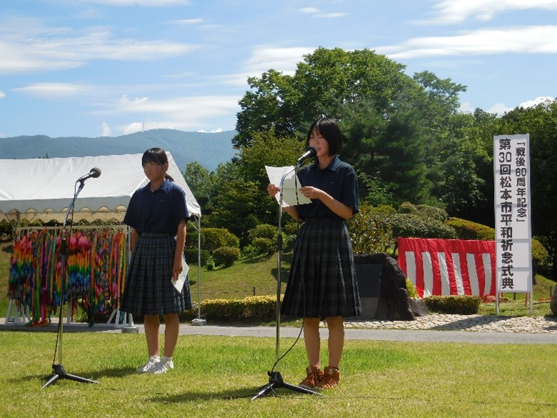 80回目の終戦記念日を迎えた令和7年8月15日、松本市では第30回松本市平和祈念式典を開催し、市内小中学生を中心に約240名が参列しました。会場に設置した折鶴献呈台には、市内小中学校や各種団体ほか多くの市民の方が平和を願って折られた折鶴が献呈されました。式典では、代表者5名による「折鶴献呈」、小学生代表2名による「平和都市宣言の朗読」や、中学生代表2名による「平和への思いの発表」が行われました。