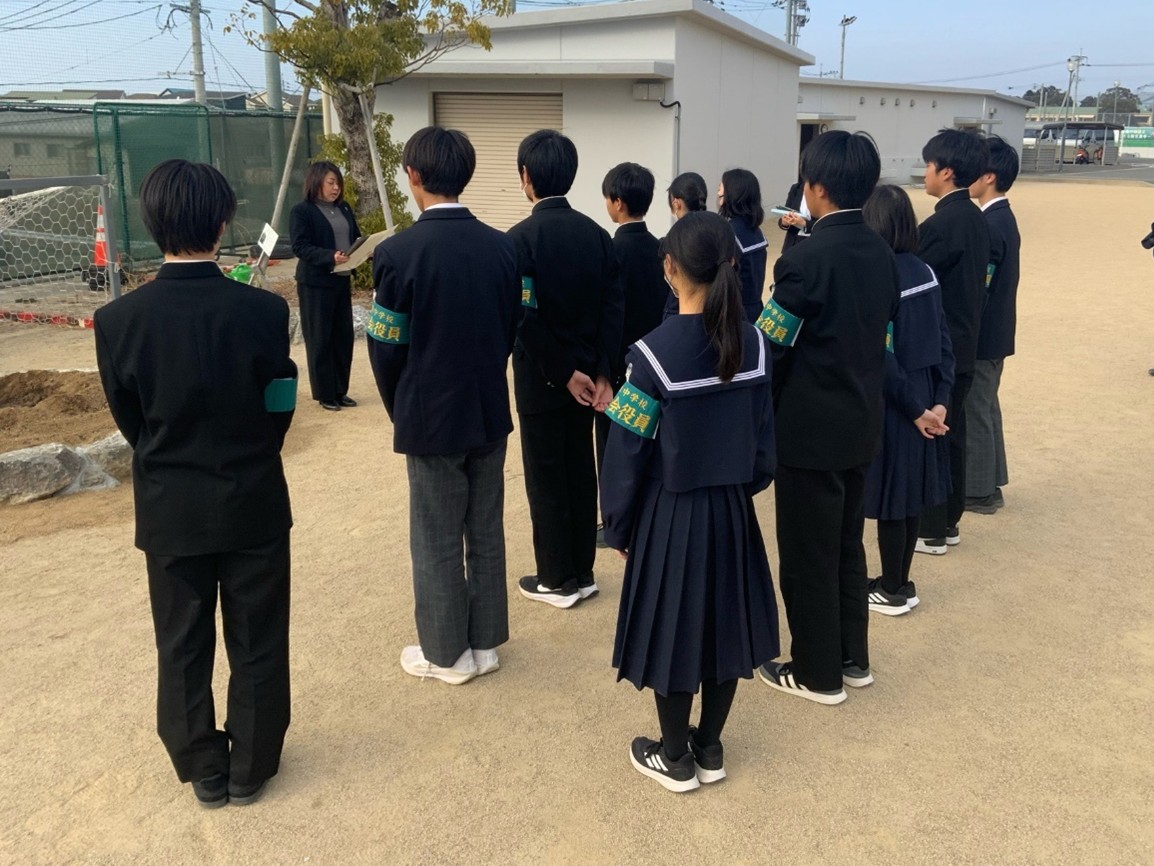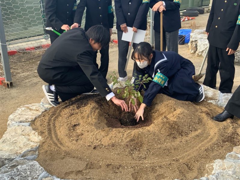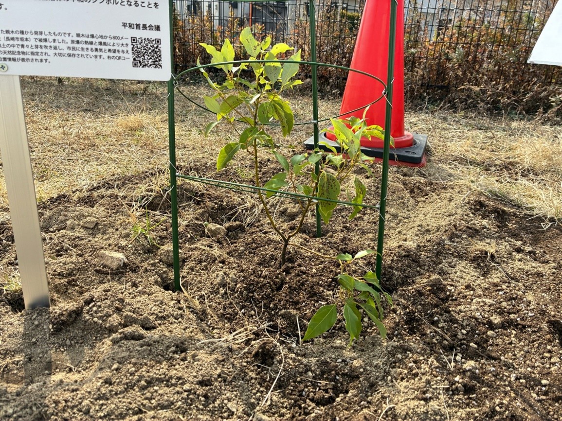 新宮町立新宮東中学校では、生徒会役員11人が苗木を植樹しました。植樹に際し、生徒会学習委員長から「今日の平和に感謝し、その尊さを心に刻み、次の世代へ繋いでいくこと。それが私たち中学生の果たすべき役割です。被爆クスノキ二世の成長から戦争の悲惨さと平和の尊さを学び続けていきます。」と決意の言葉が述べられました。